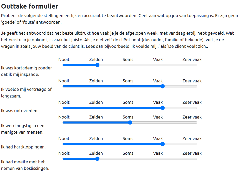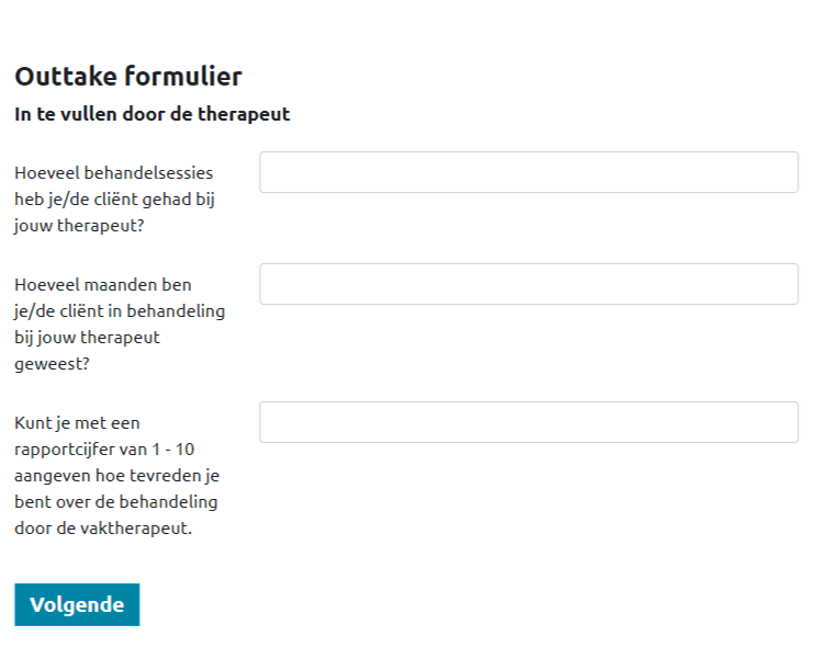 Hieronder staat het outtake formulier. Op het moment dat de behandeling is afgelopen mag de cliënt dit formulier invullen.