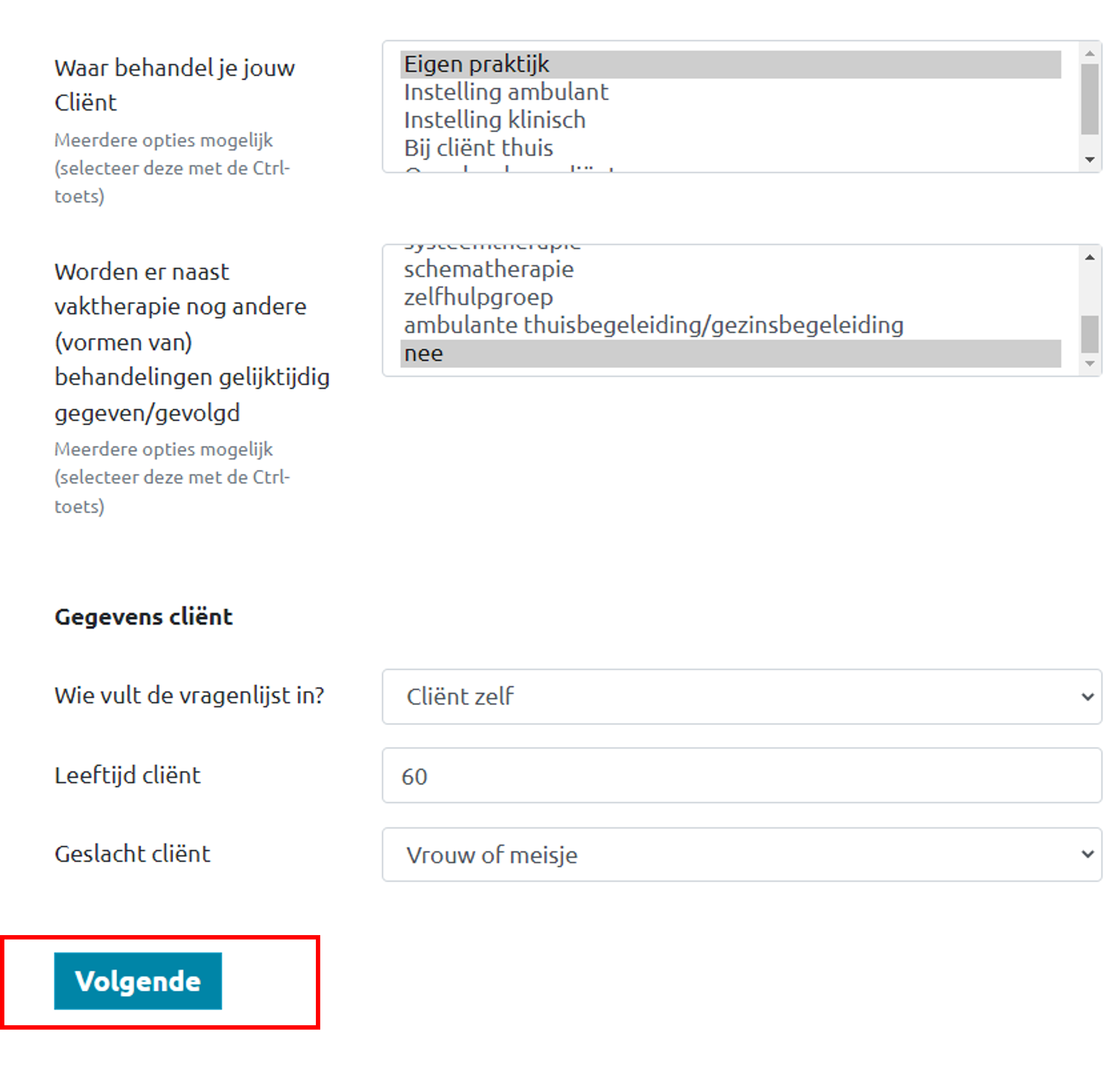 De eerste paar vragen moeten door jou als vaktherapeut ingevuld worden.