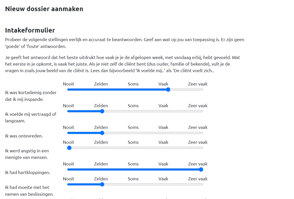 De rest van de vragenlijst wordt ingevuld door de cliënt. Als de vragenlijst is ingevuld, vind je de ingevulde vragenlijst als pdf terug op de pagina Mijn dossiers. Het kost een cliënt gemiddeld 8 minuten om de vragenlijst in te vullen.