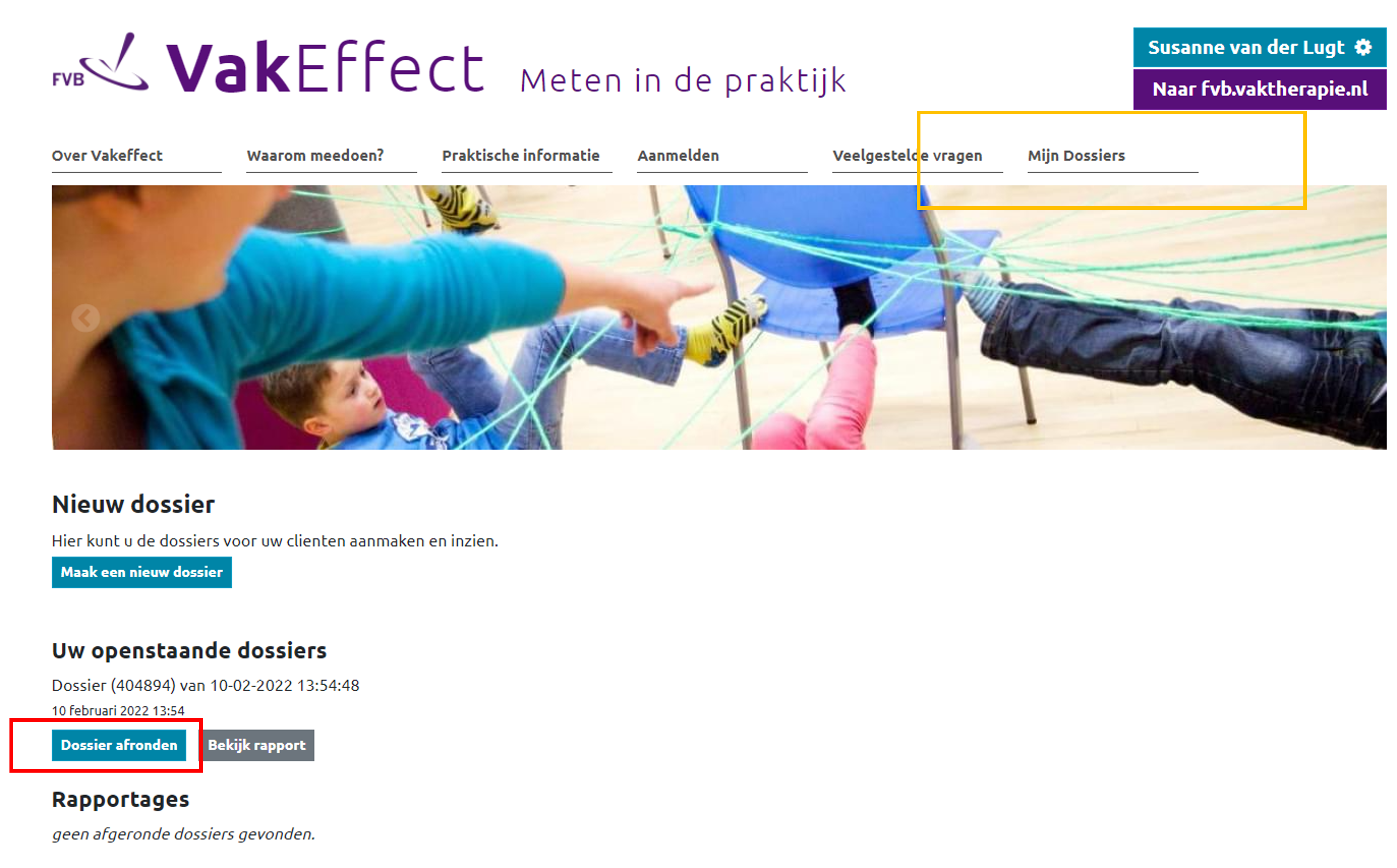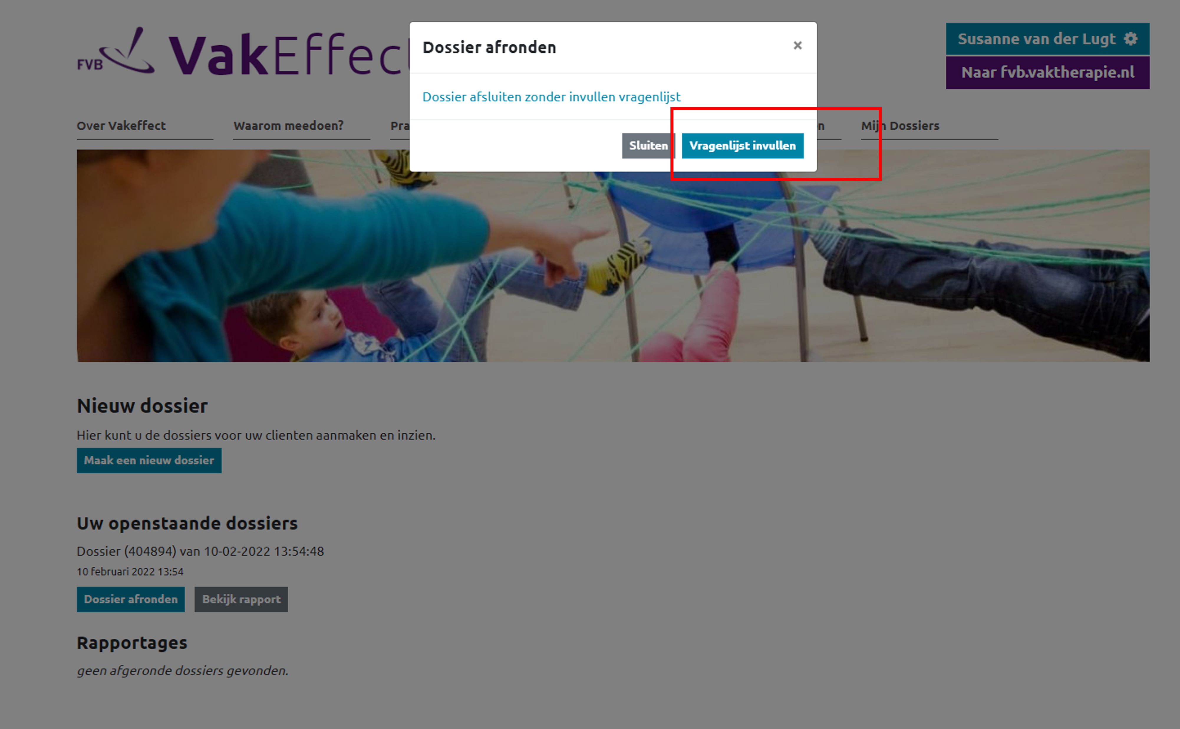 Bij de afronding van de behandeling laat je je cliënt de vragenlijst voor de tweede keer invullen. Je logt hiervoor weer in op vakeffect.vaktherapie.nl en kiest op de pagina Mijn dossiers voor 'Dossier afronden'. Als meerdere cliënten een vragenlijst hebben ingevuld, dan krijg je een overzicht van de reeds ingevulde vragenlijsten. Dit overzicht bevat de 'Optionele naam' die je mogelijk hebt meegegeven (let op: vul hier nooit de volledige naam van de cliënt in in verband met de privacyregelgeving) en de datum en het tijdstip waarop de eerste vragenlijst is ingevuld. Je kunt dan kiezen welk dossier je wilt afronden.